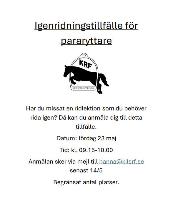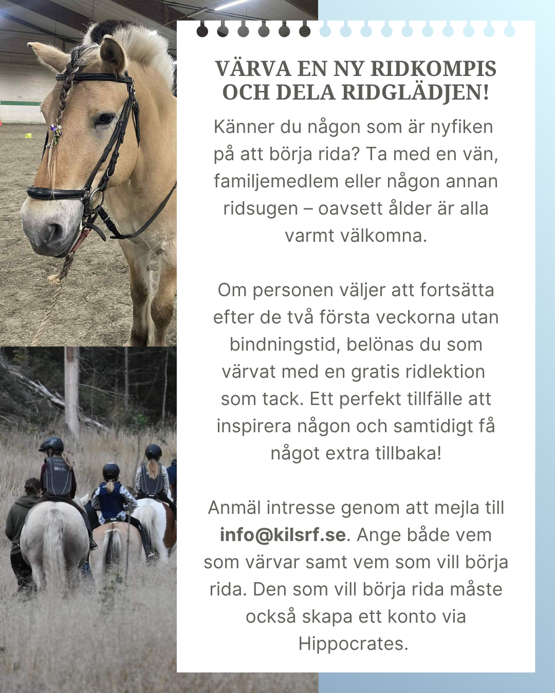 Värva en ridkompis och få en gratis ridlektion som tack. Mejla till info@kilsrf.se.
